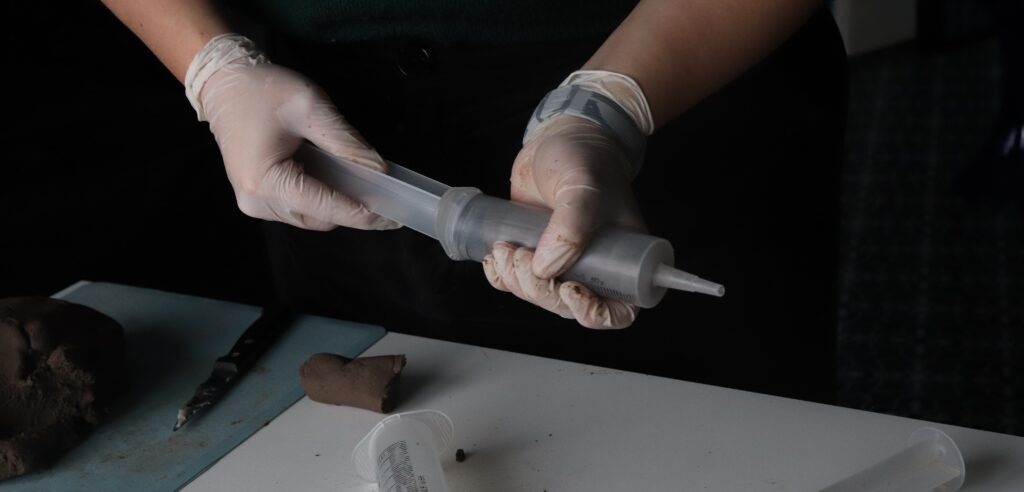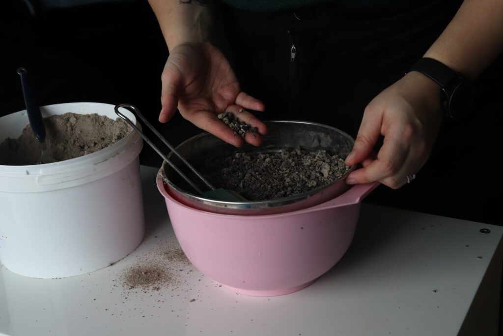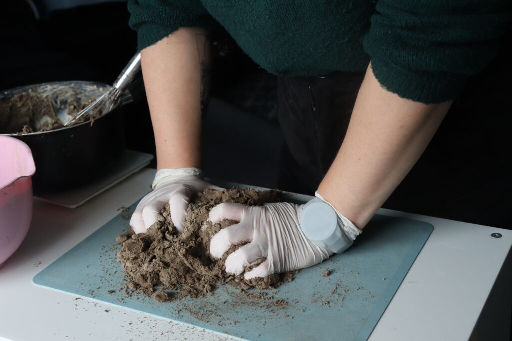 Aujourd’hui, j’ai développé 4 matériaux à partir de la cendre Grisure, Basalt, Grenue, et Regolith. Tous sont biosourcés et ont une composition majoritaire en cendre. Ce second critère permet au liant de s’effacer pour révéler l’aspect sensible de la matière.