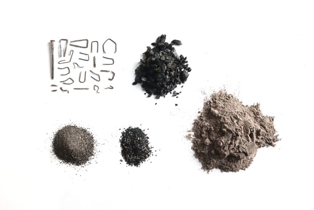 Il existe différents types de cendres. D’une part les cendres domestiques, issues de poêles, fours, cheminées et de la combustion de déchets verts. Elles sont produites par les particuliers et les restaurateurs. D’autre part les cendres industrielles notamment issues des usines thermiques. À la différence des premières, celles-ci sont valorisées dans le secteur agricole comme engrais et dans le milieu de la construction comme charge pour béton. Aujourd’hui, les cendres domestiques ne connaissent pas d’usage répandu et possèdent un statut de déchet. Résidu de la combustion de matière organique, la cendre est volatile et friable. Visuellement, elle apparaît sous forme de poudre terne. Ces qualités donnent à la cendre un aspect salissant, ce qui fait d’elle une matière non acceptée dans l’univers domestique. L’objectif de ce projet est de valoriser cette matière, par son utilisation dans un matériau.